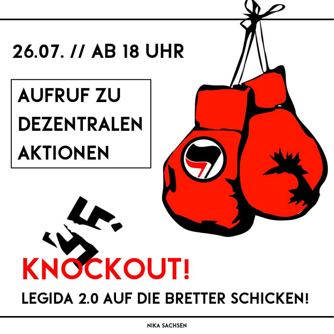 Am 26. Juli wird es zum wiederholten Male zu einem Naziaufmarsch im Innenstadtbereich von Leipzig durch das rechte Sammelsurium von Legida 2.0 kommen. Das erfordert ein konsequentes Einschreiten, um die rechten Hippies, Antisemit*innen und Faschist*innen auf die Matte zu schicken. Deshalb rufen wir erneut zu einem dezentralen Protest auf, um den Naziaufmarsch unmöglich zu machen und einmal mehr zu zeigen wem die Stadt gehört. Denn in Leipzig ist kein Platz für Antisemitismus, rechte Hetze und jeglicher Nazi Propaganda! Bringen wir mehr als deutlich eine antifaschistische Intervention auf die Straße, organisiert euch und bildet Banden!