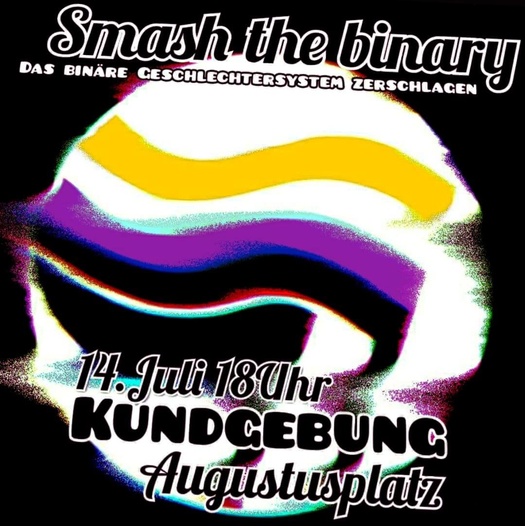 Deshalb rufen wir alle nicht-binären Menschen und alle Verbündeten dazu auf, am 14.07. um 18 Uhr zum Augustusplatz zu kommen. Wir wollen unsere Existenz und unsere politischen Forderungen lautstark in die Öffentlichkeit tragen, uns vernetzen und empowern!