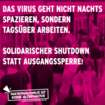 Gegen autoritären Populismus und neoliberale Seuchenverwaltung Willkommen in der dritten Welle: Statt etwas gegen die echten Corona-Partys in Großraumbüros, Amazon-Centern und den Fabriken zu machen, werden die Kontaktbeschränkungen im Privaten verschärft - und eine abendliche Ausgangssperre verhängt. Ansteckungen finden aber nach wie vor dort statt, wo viele Menschen … [Weiterlesen...]