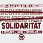 Fahrt mit uns zur Großdemonstration gegen das niedersächsischen Polizeigesetz (NPOG) am 08.12. in Hannover – kommt zum linksradikalen Block gegen Rechtsruck und Polizeistaat! Nachdem – trotz breit getragener Proteste mit mehreren zehntausend Teilnehmer*innen – die Landesregierungen in Bayern und NRW ihre Polizei(aufgaben)gesetze massiv verschärft haben, will nun auch die … [Weiterlesen...]