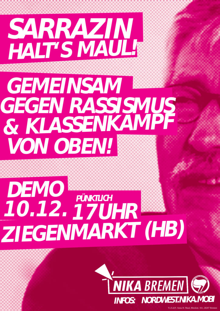 Auch bei Sarrazin ist die Kombination aus wirtschaftlicher Elite und blankem Rassismus weder Zufall noch Widerspruch. Ganz im Gegenteil: hier passt Arsch auf Eimer. Für sein Publikum heißt dies: Wer eintausend Euro im Jahr für eine Clubmitglischaft zahlt und bei OHB Weltraumtechnik im Vorstand sitzt, kann sich am Feierabend Sarrazins Thesen über den Islam bei einem guten Glas Wein anhören und am nächsten Morgen wieder Leiharbeiter*innen gegen Stammbelegschaft ausspielen.