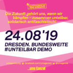 Am Wochenende waren wir zum für unseren Block auf der #unteilbar Demo in Dresden. Mit We’ll come united, Tribunal “NSU-Komplex auflösen” und vielen weiteren Genoss*innen aus Bautzen, Görlitz und Chemnitz planen wir den antifaschistischen und antirassistischen Block, mit dem wir zeigen, dass unsere Antwort auf den Neuen Faschismus heißt: Solidarität verteidigen! Gemeinsam … [Weiterlesen...]