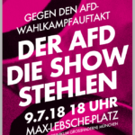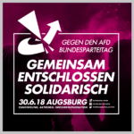 Gemeinsam - Entschlossen - Solidarisch! Am 30. Juni und 1. Juli will die Alternative für Deutschland ihren Bundesparteitag in Augsburg abhalten. Während die AfD munter weiter daran arbeitet, mit ihrer durchweg menschenfeindlichen Agenda mehr gesellschaftliche Macht zu erlangen und sich mit besten Aussichten auf zweistellige Ergebnisse auf die bayerische Landtagswahl im … [Weiterlesen...]