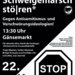 Am Sonntag den 22.11. wollen erneut Verschwörungsideolog*innen ihre kruden und antisemitischen Ansichten auf die Straße tragen. Wir rufen zu Störaktionen auf! Kommt zum Treffpunkt: 13:30 Uhr Gänsemarkt. Organisiert euch in Bezugsgruppen, bringt Transpis mit und alles, was Krach macht! Tragt aus Hygieneschutzgründen bitte unbedingt Masken – diese helfen auch, euch vor den … [Weiterlesen...]