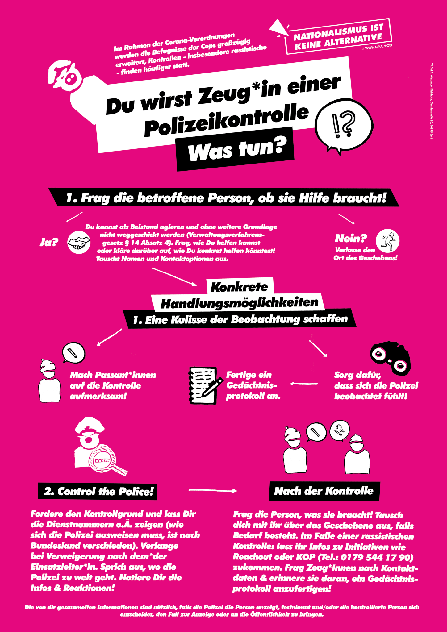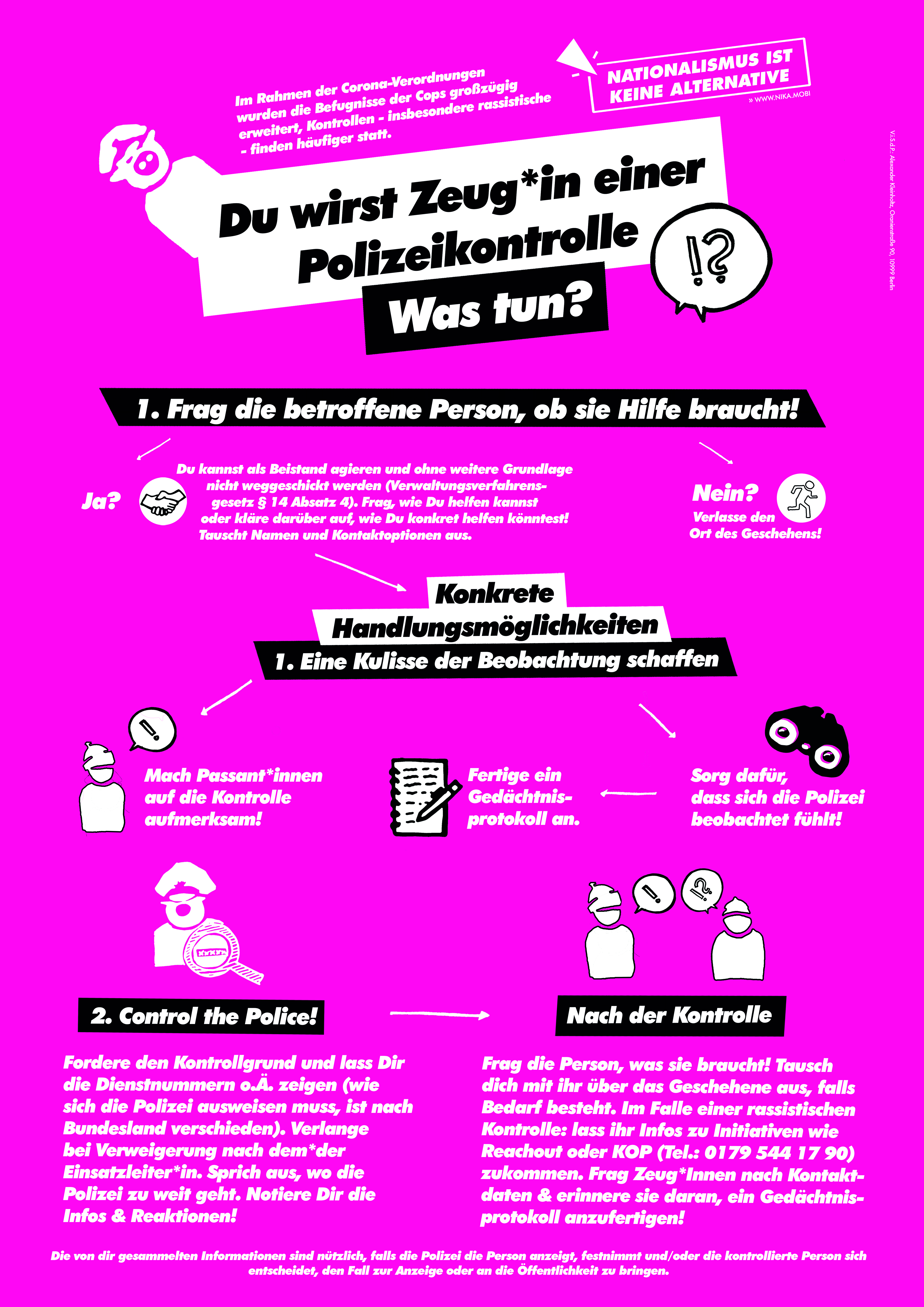 Im Rahmen der Corona-Verordnungen wurden die Befugnisse der Cops großzügig erweitert, Kontrollen und Eingriffe in die Freiheitsrechte von Menschen – insb. von Menschen mit Migrationshintergrund – finden häufiger statt. Wir wollen mit dem folgenden Plakat eine praktische Hilfestellung geben, die aufzeigt, wie man sich als Zeug*in von Polizeikontrollen hilfreich verhalten kann: