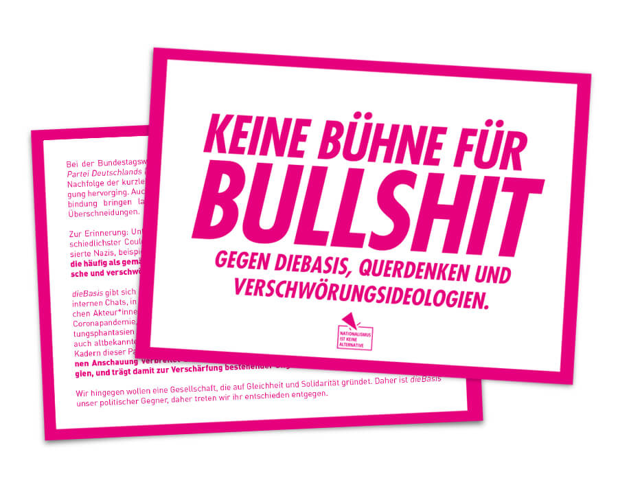 dieBasis gibt sich in ihrer Außenwirkung größte Mühe als harmlos und bürgerlich zu erscheinen. In internen Chats, in Telegramgruppen oder auf Querdenkenkundgebungen äußern sich ihre maßgeblichen Akteur*innen jedoch immer wieder gänzlich anders: Leugnungen und Verharmlosungen der Coronapandemie, geschichtsrevisionistische Behauptungen („KZs für nichtgeimpfte“), Vernichtungsphantasien gegenüber den für die Coronamaßnahmen verantwortlichen Politiker*innen, aber auch altbekannte Verschwörungsideologien von „BRD-GmbH“ oder Chemtrails gehören unter den Kadern dieser Partei offenbar zum guten Ton. Unter dem Deckmantel einer vermeintlich weltoffenen Anschauung verbreitet dieBasis verkürzte Krisenerklärungen und Verschwörungsideologien, und trägt damit zur Verschärfung bestehender Ungleichheiten bei.