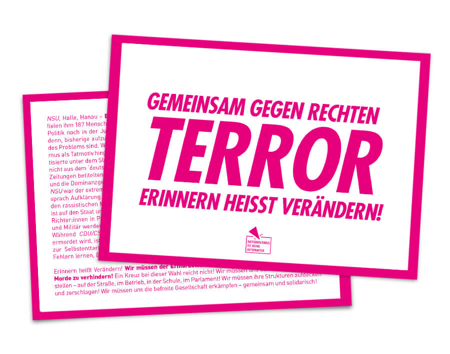 Erinnern heißt Verändern! Wir müssen der Ermordeten Gedenken und alles daran setzen, weitere Morde zu verhindern! Ein Kreuz bei dieser Wahl reicht nicht! Wir müssen uns den Rechten entgegenstellen – auf der Straße, im Betrieb, in der Schule, im Parlament! Wir müssen ihre Strukturen aufdecken und zerschlagen! Wir müssen uns die befreite Gesellschaft erkämpfen – gemeinsam und solidarisch!