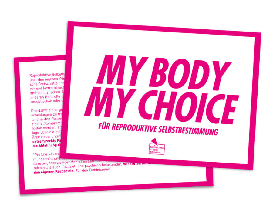 „Pro Life“-Akteur:innen räumen einem Fötus einen höheren Stellenwert ein, als dem Selbstbestimmungsrecht und der Gesundheit einer schwangeren Person. Repressive Maßnahmen tragen nicht dazu bei, dass weniger Menschen abtreiben – Abtreibungen sind dadurch lediglich wesentlich risokoreicher als auch finanziell und psychisch belastender. Wir treten für die Selbstbestimmung über den eigenen Körper ein. Für den Feminismus!