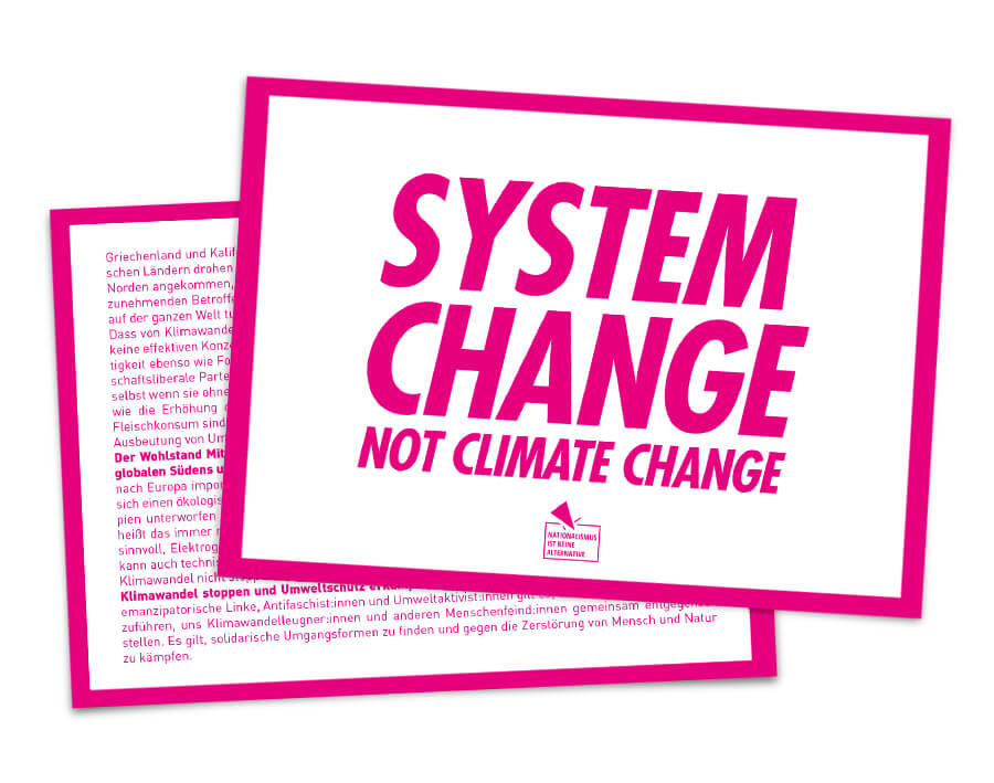 Klimawandel stoppen und Umweltschutz erkämpfen heißt also auch Kapitalismus überwinden! Als emanzipatorische Linke, Antifaschist:innen und Umweltaktivist:innen gilt es, unsere Kämpfe zusammenzuführen, uns Klimawandelleugner:innen und anderen Menschenfeind:innen gemeinsam entgegenzustellen. Es gilt, solidarische Umgangsformen zu finden und gegen die Zerstörung von Mensch und Natur zu kämpfen.