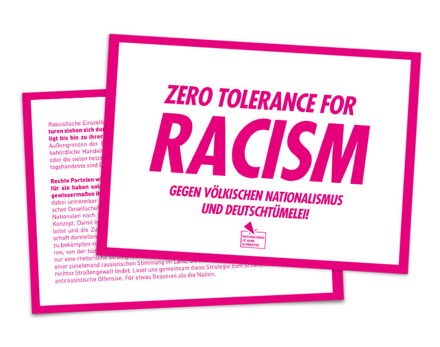 Rechte Parteien wie die AfD haben kein Monopol auf derartige Ideologien der Ungleichheit. Aber für sie haben solche Konzepte der sozialen Ungleichheit eine zentrale Bedeutung, es macht gewissermaßen ihren Markenkern aus. Ihr Rassismus und ihr Begriff dessen, was Deutsch ist, sind dabei untrennbar verbunden. Als wäre das Konzept der Nation als Konstrukt moderner kapitalistischer Gesellschaften nicht ohnehin zweifelhaft genug, AfD und Co. gehen in ihrem Verständnis des Nationalen noch einen Schritt weiter. In bester deutscher Tradition vertreten sie einen völkisches Konzept. Damit ist gemeint, dass Deutschsein sich aus angeblicher biologischer Abstammung herleitet und die Zugehörigkeit, bzw. das Nicht-Dazugehören eine unentrinnbare Schicksalsgemeinschaft darstellen. Alles was dabei als Nicht-Deutsch angesehen wird, wird als bedrohlich und somit zu bekämpfen inszeniert. Die AfD geht dabei mittlerweile nur allzu offen mit ihren Ansichten hausieren, von der bürgerlichen Fassade ist wenig übrig geblieben. Dabei ist diese Radikalisierung nicht nur eine rhetorische Strategie, die die Grenzen des Sagbaren verschieben soll. Sie wird flankiert von einer zunehmend rassistischen Stimmung im Land, die ihren heftigsten Ausdruck in Anschlägen und rechter Straßengewalt findet. Lasst uns gemeinsam diese Strategie zum Scheitern bringen. Für eine antirassistische Offensive. Für etwas Besseres als die Nation.