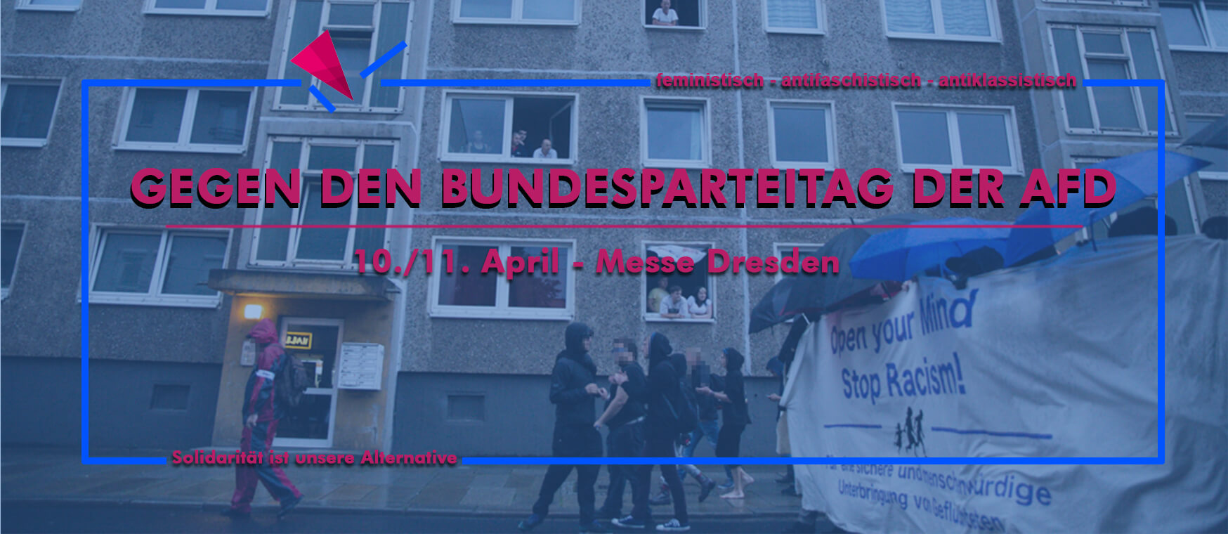 Mit den Protesten gegen den AfD-Parteitag im April wollen wir nicht nur gegen die faschistische Politik der Partei demonstrieren. Wir wollen ihrer Politik der sozialen Spaltung einen solidarischen Gesellschaftsentwurf entgegenstellen. Wir wollen die Stimmen all derer stark machen, die sich täglich in sozialen Bewegungen für ein anderes, ein solidarisches Miteinander einsetzen. Wir wollen uns mit den Aktivist*innen solidarisieren, die sich dafür einsetzten, dass jede*r mitbestimmen kann, wie städtisches Leben aussehen soll. Wir stehen mit all jenen zusammen auf, die gegen Zwangsräumungen aufbegehren und sich dafür engagieren, das Wohnraum bezahlbar bleibt. Genauso wie mit denjenigen, die auf dem Land für bessere Infrastruktur und Perspektiven kämpfen. Wir wollen Seite an Seite mit den Umweltaktivist*innen dafür sorgen, dass die Klimakrise angegangen und Schritte eingeleitet werden, die allen Menschen ein selbstbestimmtes und ökologisches Leben auf der Erde ermöglichen. Wir sind solidarisch mit den weltweiten Kämpfen von FLINT* Personen – ob in Istanbul, London oder Dresden: Feminismus ist die Lösung! Wir wollen die Stimmen derer hören, die täglich von Rassismus und Polizeigewalt betroffen sind. Die unterstützen, die mit ihren Rettungsmissionen dafür sorgen, dass Geflüchtete nicht im Mittelmeer ertrinken oder auf dem Balkan verelenden und sich damit dem mörderischen Grenzregime der EU widersetzen. Wir sind solidarisch mit den Pflegekräften, die gerade nicht nur alles dafür tun, dass die medizinischen Folgen der Corona-Pandemie abgemildert werden, sondern sich auch dafür einsetzten, dass Gesundheit keine Ware bleibt. Wir wollen Arbeiter*innen in ihren Arbeitskämpfen unterstützen und die Betroffenen negativen Auswirkungen von Arbeitsmigration anprangern. Wir sagen Nein zur Repression und solidarisieren uns mit allen Antifaschist*innen, die aufgrund ihres Kampfes gegen Rassismus, Antisemitismus und Ausgrenzung mit Ermittlungsverfahren überzogen werden.