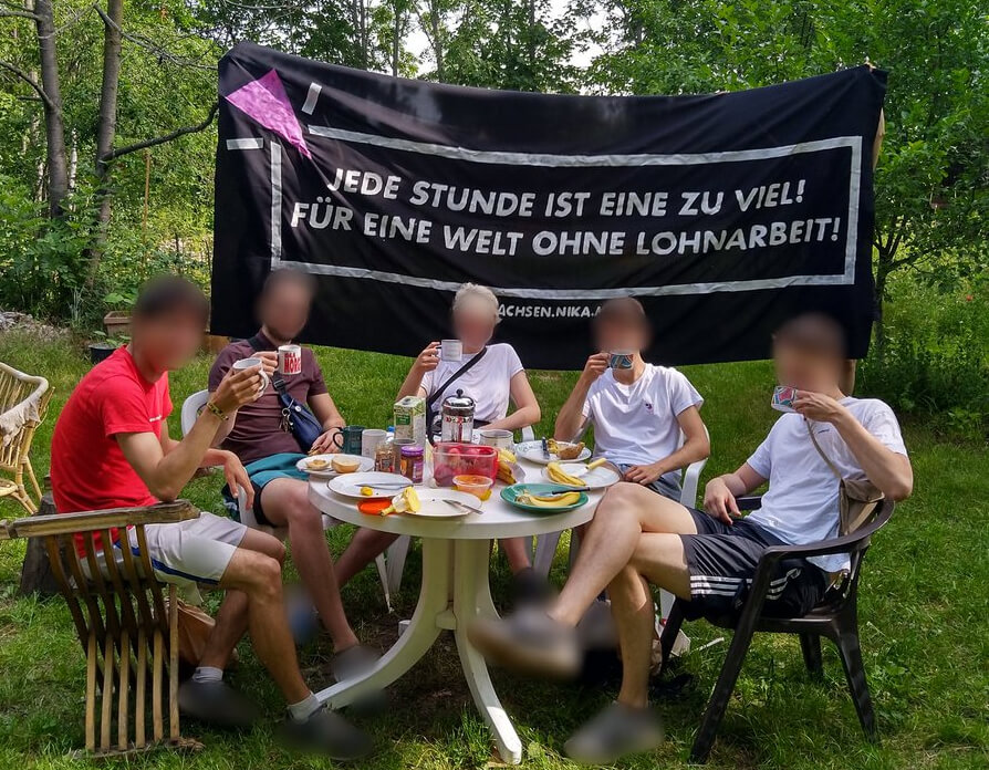 Beim Auswärtsspiel der ersten Herren des Roten Stern Leipzig in Bad Lausick zeigten Fans ein Transparent mit der Aufschrift „MAKE FEMINISM A THREAT AGAIN! – NIKA SACHSEN“. Kia Schröder dazu: „Besonders die feministischen Errungenschaften des letzten Jahrhunderts werden im aktuellen Rechtsruck in Frage gestellt. Wir lassen uns das weder von der AfD noch von der sächsischen CDU bieten und werden stattdessen noch für weitere feministische Fortschritte kämpfen. Etwa die Abschaffung des Paragraphen 218 und die Beseitigung des Gender Pay Gap!“. Die Solidarische Jugend Leipzig veranstaltete im Rahmen des Aktionstages ein lohnarbeitskritisches Kaffee-Trinken und zeigte sich mit einem Transparent mit der Aufschrift: „Jede Stunde ist eine zu viel! Für eine Welt ohne Lohnarbeit!“. „Arbeitsplätze werden gern als Argument für reaktionäre Politik wie die Fortsetzung der Kohleverstromung oder die nationale Abschottung gegenüber Migrant*innen genutzt. Wir stellen deshalb das Konzept der Lohnarbeit in Frage und setzen uns für eine Gesellschaft ein, in die ökonomische Versorgung der Einzelnen nicht von ihrer Arbeitsleistung abhängt“, kommentierte Kia Schröder die Aktion. Zum Abschluss des Aktionstages posierte das Café Connect mit Pyrotechnik und Flaggen der autonomen Region Rojava in Nordsyrien. „Für uns ist Rojava nicht nur ein Ort am anderen Ende der Welt, sondern ein nachahmenswertes Gesellschaftsmodell des demokratischen Konförderalismus das fernab von staatlichen, nationalen und kapitalistischen Strukturen gelebt wird“, so die Aktivist*innen. „Junge Leute in Sachsen haben an diesem Wochenende gezeigt, dass sie sehr genaue Vorstellungen davon haben, wie eine fortschrittliche Gesellschaft aussehen sollte. Das war uns an diesem Aktionstag besonders wichtig zu betonen: Wir sind nicht einfach nur gegen die AfD. Wir teilen auch die Vorstellungen der anderen etablierten Parteien nicht. Wir haben eine gesellschaftliche Vision, die es Menschen aller Geschlechter ermöglicht ökonomisch versorgt zu sein und an politischen Entscheidungen teilzuhaben. Eine Gesellschaft eben, die Nationalstaat, Patriarchat und Kapitalismus hinter sich lässt“, lautet Kia Schröders Fazit des Aktionstages.