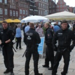 Schon am Vormittag versammelten sich Antifaschist*innen in der Lüneburger Innenstadt, da der Infostand der AfD für den Vormittag erwartet wurde. Nachdem bekannt wurde, dass sie erst um 14 Uhr erscheinen wollte, verabredete mensch sich für den Nachmittag. Bevor die AfD´ler ihren Stand aufbauten versammelte mensch sich um den Standort und verblieb bis zum Ende der erfolglosen Aktion der AfD.Die Polizei erschien wie schon am 26. März 2016 mit einem großen Aufgebot. Insgesamt waren 80 Polizeibeamte aus Oldenburg und Lüneburg eingesetzt. Während ein Großteil der Beamten den Stand der AfD sicherten, waren Teile einer „Beweissicherungs- und Festnahmeeinheit“ (BFE) in unmittelbarer Nähe postiert.