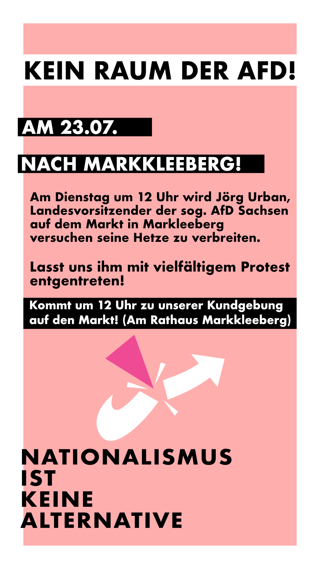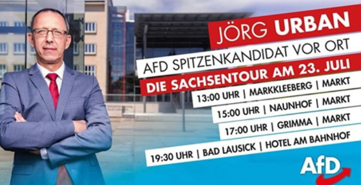 Morgen am 23. Juli plant der Spitzenkandidat der sächsischen AfD Jörg Urban seine Vorstellungen für eine rechtsautoritäre Wende auf einer Tour durch einige sächsische Städte zu verbreiten. Mit dabei sind Markkleeberg, Naunhof, Grimma und Bad Lausick. NIKA Leipzig mobilisiert zu Gegenprotesten. Um 12 Uhr ist in Markkleeberg am Rathausplatz eine Gegenkundgebung angemeldet. Kommt mit uns macht klar, dass Nationalismus keine Alternative ist!