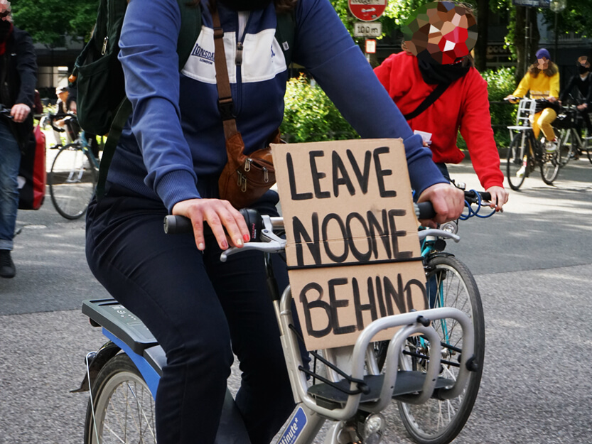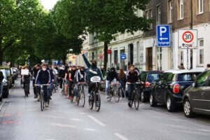 Zum Abschluss gab es am 3. Mai drei spontane Fahrrad-Korsos die mit Schildern, Musik und Redebeiträgen aus gekoppelten Bluetooth-Boxen und Wurfzettelchen mit etwa 100 Leuten lautstark durch die Isarvorstadt, Haidhausen und Schwabing fuhren. Die Polizei kam mit dem unangemeldeten Protest nicht wirklich zurecht.