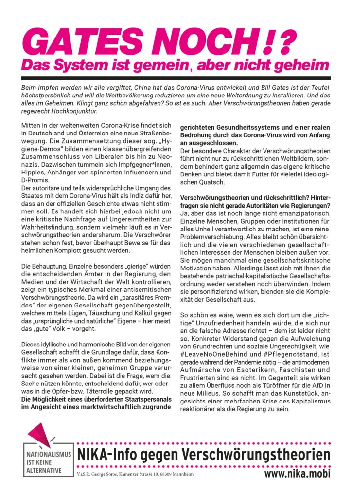 Aktivist*innen aus der Kampagne haben das NIKA-Info gegen Verschwörungstheorien erstellt. Druckt es aus und verteilt es bei Aktionen gegen die selbsternannten „Corona-Rebellen“ oder hängt es an öffentliche Orten aus.