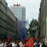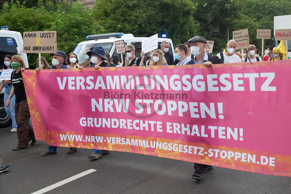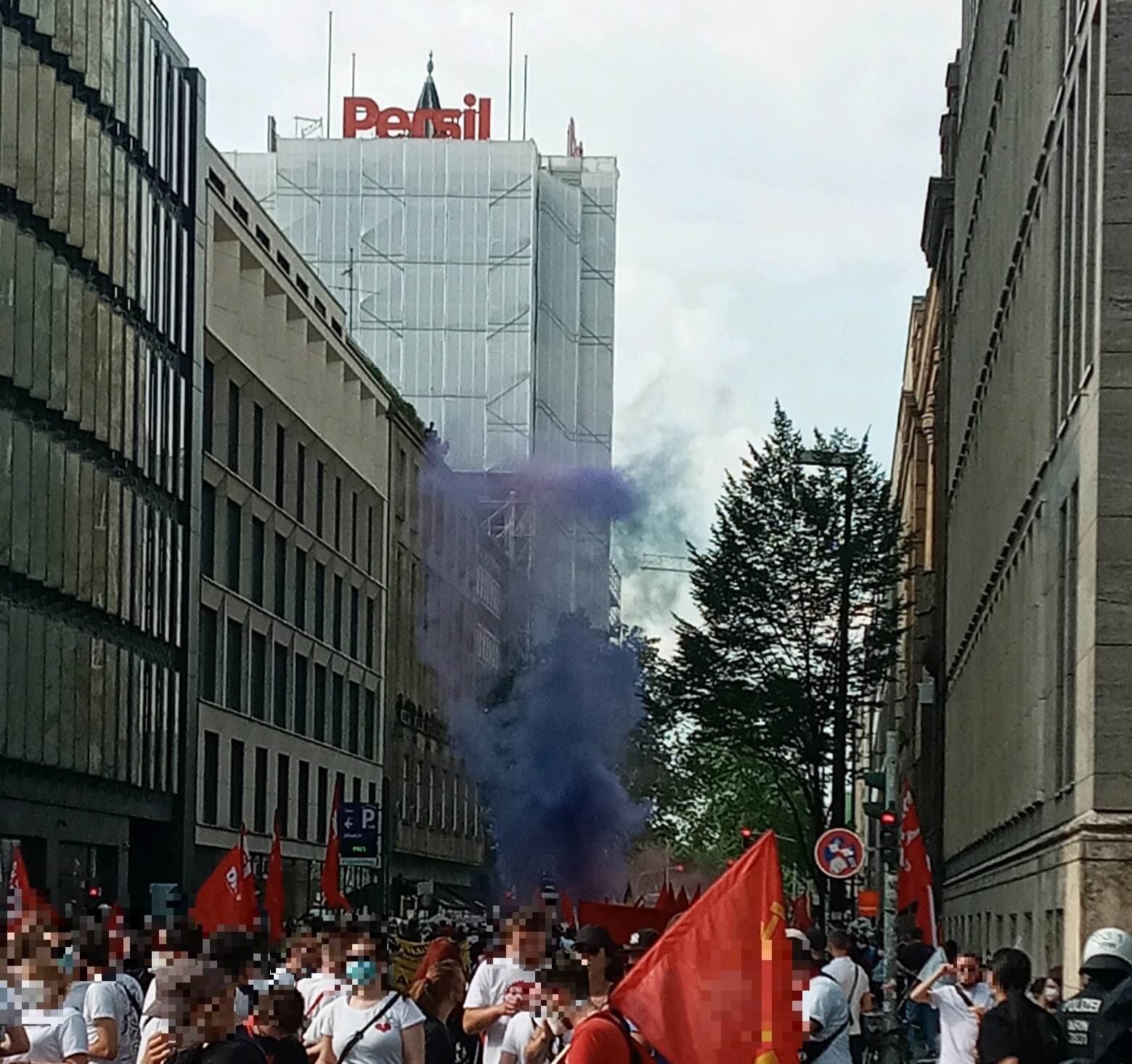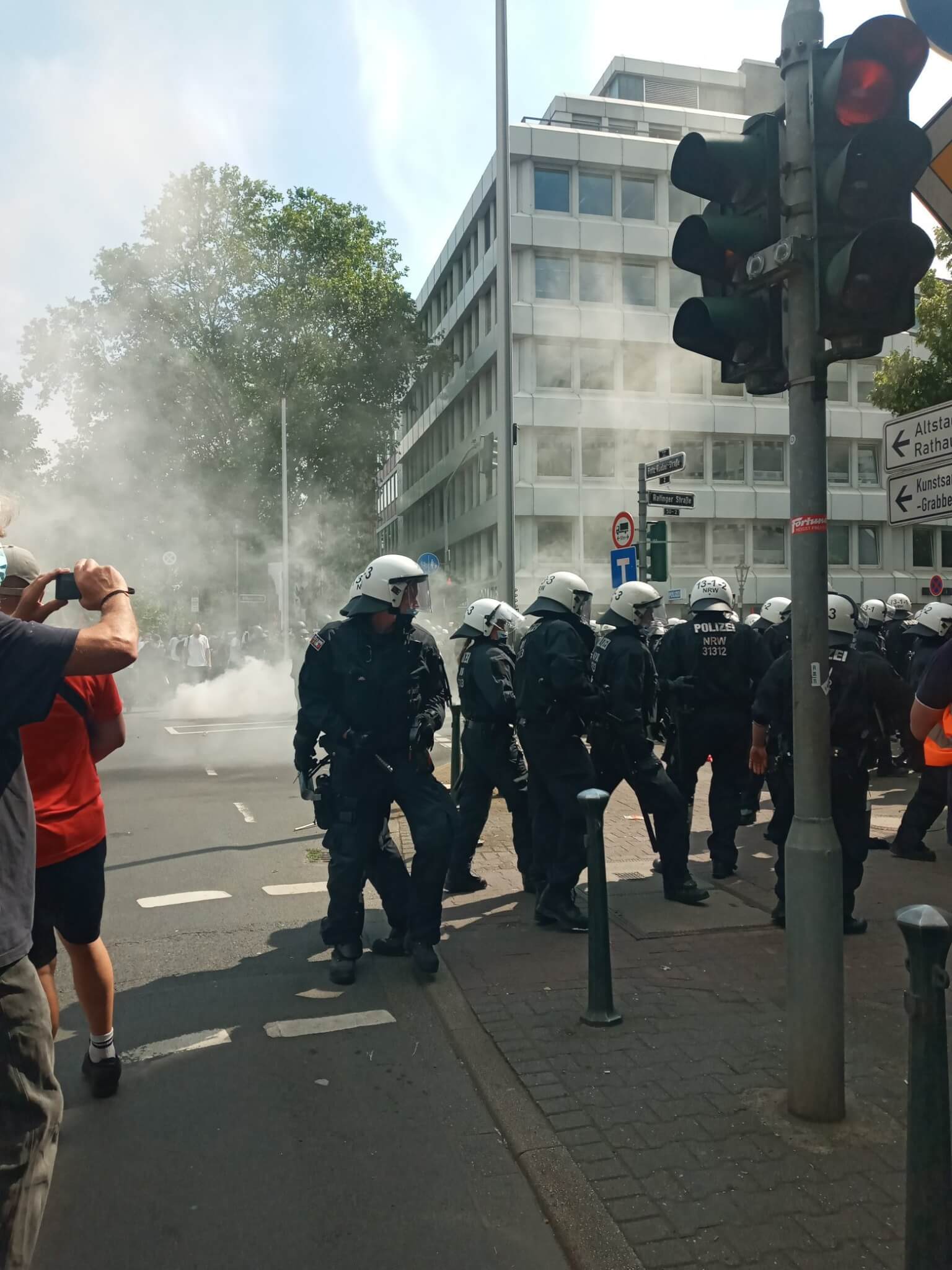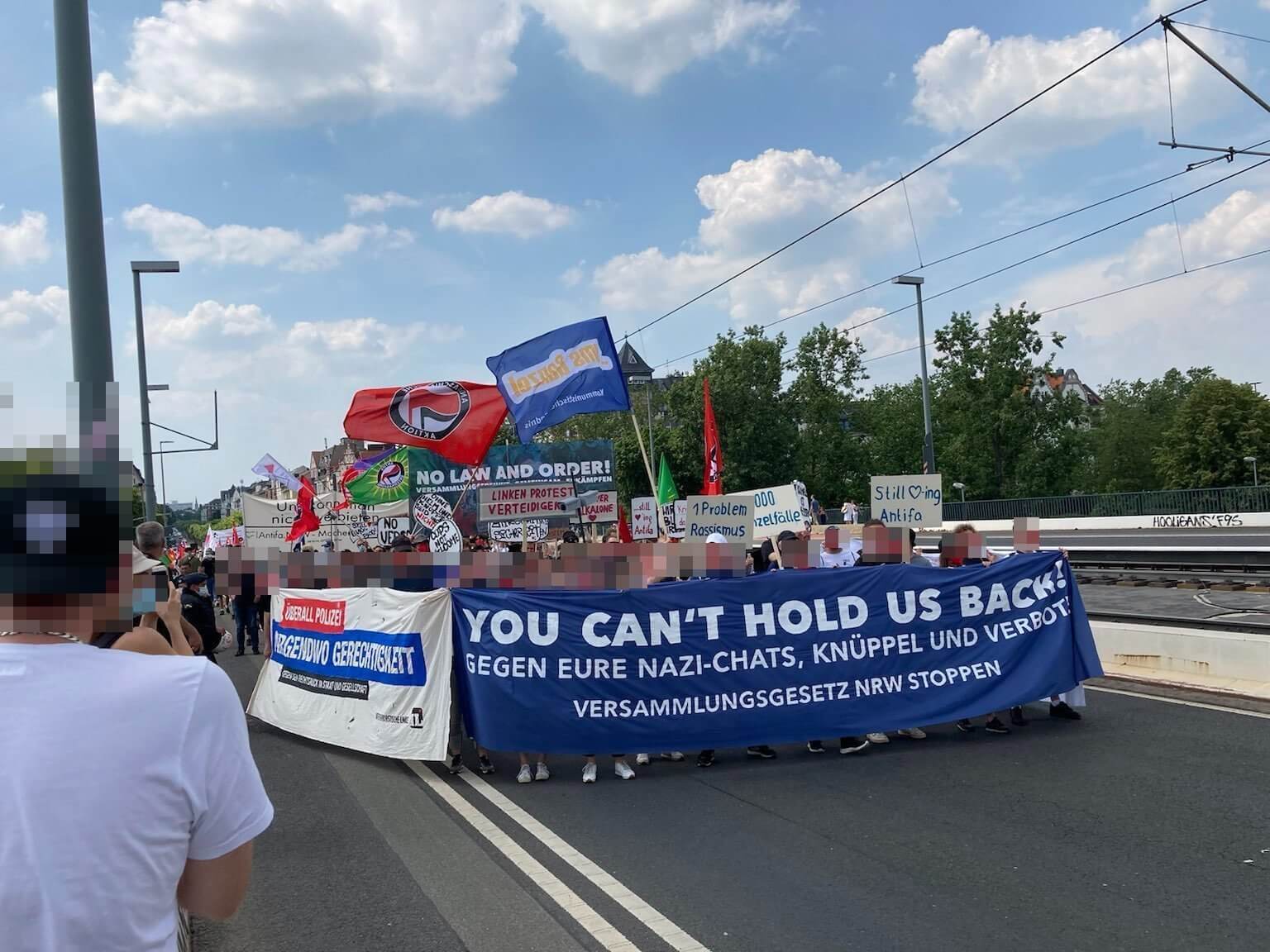 Mit 8000 Leuten waren wir gestern gegen das geplante NRW-Versammlungsgesetz auf der Straße. Offensichtlich politisch motiviert wurde schon kurz nach Beginn der Demo der Block von Antifa-Gruppen eng von der Polizei mit einem Spalier aus behelmten Einheiten begleitet. Ab diesem Zeitpunkt wurde die Demo immer wieder gestoppt, weil der Polizei das Auftreten des Blockes nicht geschmeckt hat. Der Grund für die Eskalation: Ein paar Raucheffekte und das Transparente zu hochgehalten wurden. Kurz vor Erreichen des Graf-Adolf-Platz wurden die Genoss:innen dann eingekesselt und über 8 Stunden ohne Wasser bei bis zu 30 Grad und ohne Zugang zu einer Toilette festgehalten. Die restlichen Blöcke der Demonstration solidarisierten sich mit den eingeschlossenen Antifaschist:innen und die süffisanten Angebote der Polizei, doch ohne „die Störer“ weiterzugehen, wurden konsequent abgelehnt. Stattdessen waren Menschen durchgängig am Kessel und nach dessen Auflösung bis in die Nacht an der GeSa präsent.