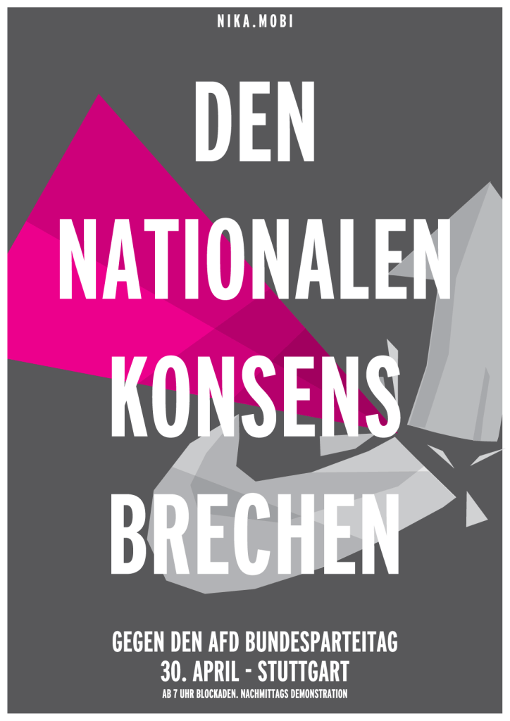 Es gab bereits einen bundesweiten Aktionstag, an dem wir der AfD in bundesweit und dezentral gezeigt haben, dass ihr Eintreten für Rassismus und Abschottung mit uns nicht zu machen ist. Am 30. April werden wir daher in Stuttgart gegen die völkische Biedermeier-Elite auf die Straße gehen.