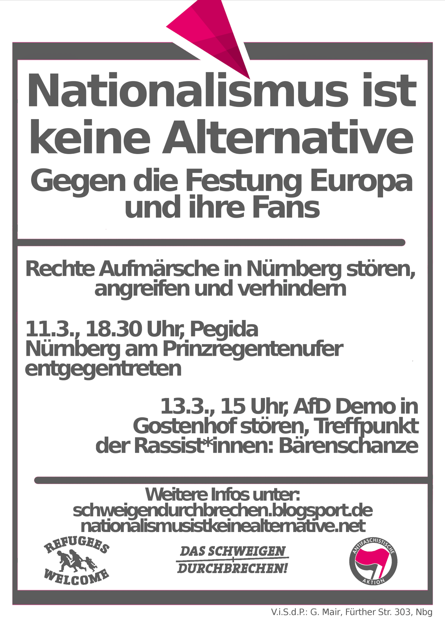 Am Sonntag, dem 13.03. um 15.00 will die AfD in Nürnberg eine Demostration zum Thema “Innere Sicherheit” durchführen. Dieses soll von der Bärenschanze zum Nürnberger Justizpalast führen. Danach will man laut eigener Ankündigung eine Wahlparty durchführen. Beides werden wir gemeinsam zum Debakel machen. Gegenproteste um ca. 14.30 im Viertel, genauer Ort und Zeit werden noch veröffentlicht.