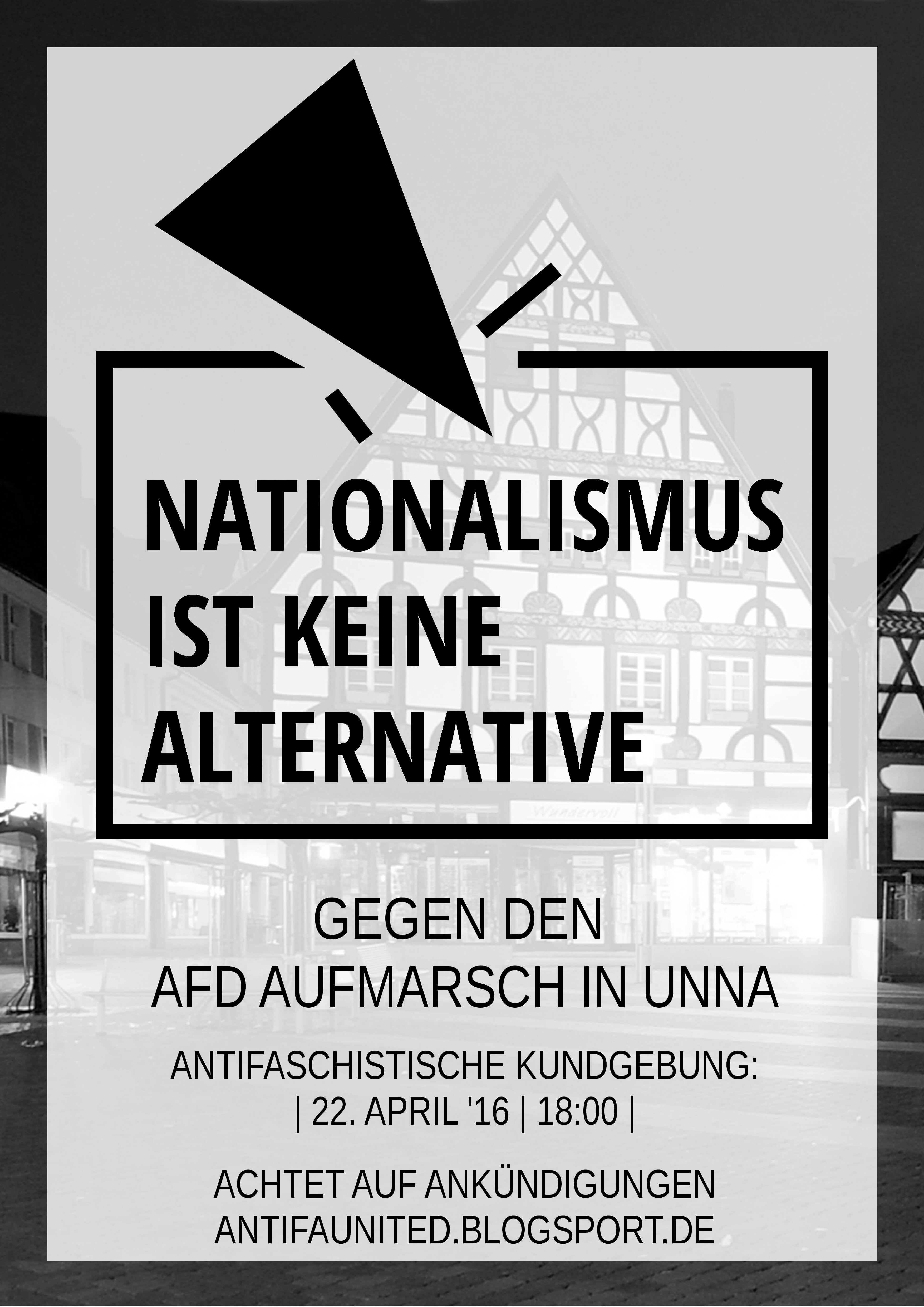 Am 22. April möchte die „Alternative für Deutschland“ einen Aufmarsch in Unna abhalten. Unter dem Motto „Merkel muss weg“ sammelt sich eine Bewegung, deren Kerninhalte aus Rassismus, Wohlstandschauvinismus und einem Familienbild aus der Steinzeit bestehen. Wir sagen: Nationalismus ist keine Alternative und rufen zu einer Kundgebung und Aktionen gegen den Aufmarsch auf.