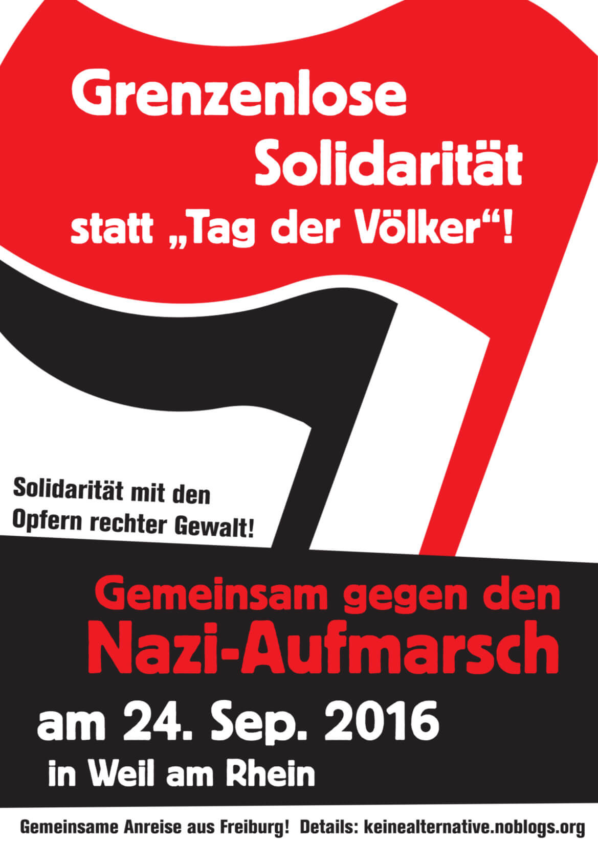 Wir dürfen die Opfer neonazistischer Gewalt und die antifaschistischen Strukturen auf dem Land nicht alleine lassen! Deshalb rufen wir dazu auf, am 24. September gemeinsam von Freiburg nach Weil am Rhein zu fahren. Zeigen wir uns solidarisch mit den Betroffenen des Nazi-Terrors und machen den Nazis ihre „Homezone“ streitig. Lassen wir den 24. September statt eines „Tags der Völker“ zu einem Tag der grenzenlosen Solidarität gegen Rassismus und Faschismus werden!