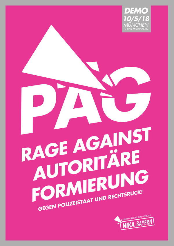 Wo Migration als Gefahr konstruiert wird und AfD und Co. von Souveränitätsverlust aufgrund unkontrollierter Grenzen faseln, inszeniert die CSU einen starken, handlungsfähigen Staat als Antwort. Fragen nach dem Sinn und Unsinn dieser Maßnahme werden erst gar nicht thematisiert. So eklig das neue PAG in seinen Einzelheiten ist, so sehr passt es in den autoritären Zeitgeist. Die Zeichen stehen auch in anderen gesellschaftlichen Bereichen auf Anpassung, Unterordnung und Aufgabe von Autonomie. Die Forderung nach harter Führung und noch härterer Bestrafung eines jeglichen von der Norm abweichenden Verhaltens ist nicht nur ein Kennzeichen extrem rechter Bewegungen, sondern scheint insgesamt auf immer weniger Widerspruch zu stoßen. Somit beinhaltet der Kampf gegen das geplante PAG für uns, dass wir uns gegen die weitergefassten ideologischen und gesellschaftlichen Zusammenhänge wehren müssen, aus denen dieses Gesetzesvorhaben entspringt. Deshalb: Beteiligt euch an den Aktionen gegen das geplante Polizeiaufgabengesetz! Kommt am 10. Mai 2018 um 13 Uhr auf den Marienplatz nach München und macht mit im antifaschistischen Block auf der Großdemo gegen das PAG!