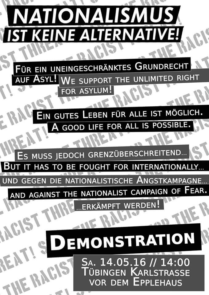 Sa. 14.05.16 // 14:00 Tübingen Karlstraße vor dem Epplehaus Die vergangenen Landtagswahlen haben einmal mehr unter Beweis gestellt: Rassistische und nationalistische Einstellungen sowie autoritäre und patriarchale Sehnsüchte sind kein rechtes Randphänomen, sondern auch in der sogenannten "Mitte" dieser Gesellschaft weit verbreitet. Mancherorts stimmte gar ein Drittel der WählerInnen für die Menschenfeinde der AfD. Mit weitreichenden […]