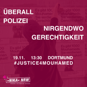 Wir, als NIKA NRW, rufen dazu auf, sich am 19.11. an der Demonstration „Es gibt 1.000 Mouhameds– Sie verdienen Gerechtigkeit!“ in Dortmund zu beteiligen. Der 16-Jährige Mouhamed Lamine Dramé wurde am 8. August 2022 in einer psychichen Notsituation durch die Dortmunder Polizei erschossen. Dieser Mord reiht sich ein in eine lange Liste von Tötungen durch Polizist*innen: Wir erinnern uns an die in Polizeigewahrsam verbrannten Oury Jalloh und Amed Ahmad. Erst vor wenigen Wochen hat die Polizei in Dortmund einen weiteren Mann mit einem Taser getötet.